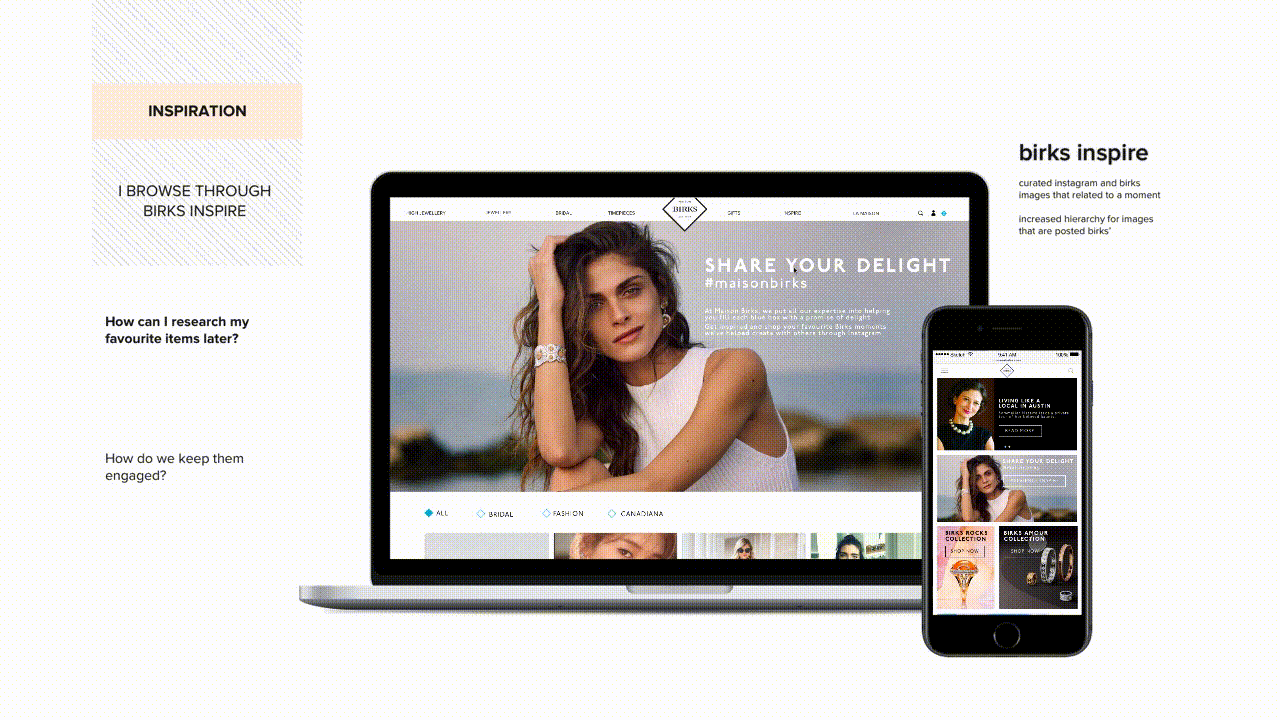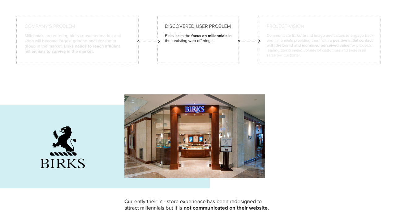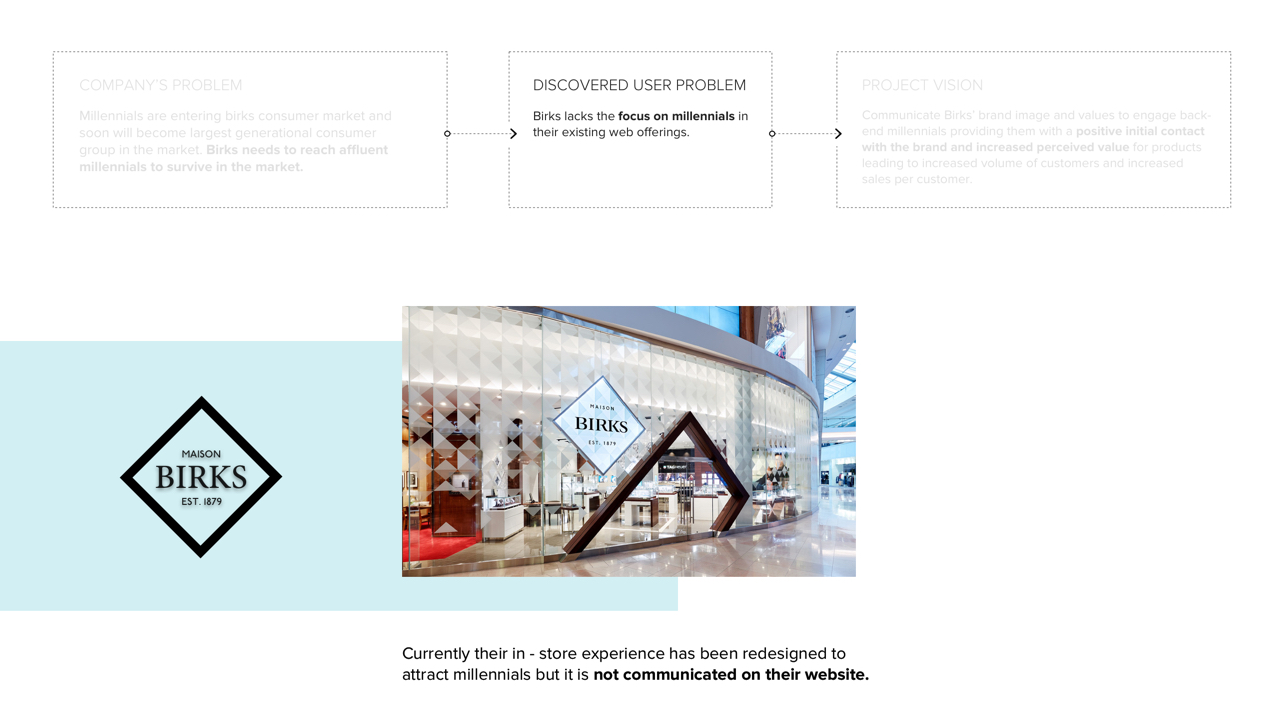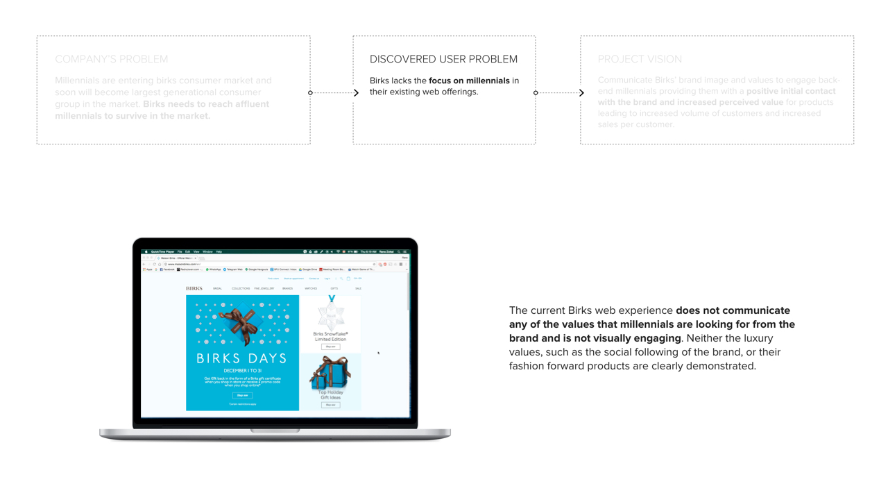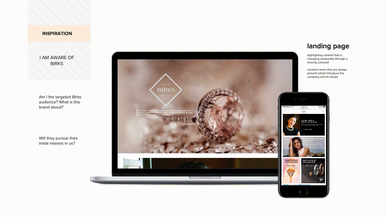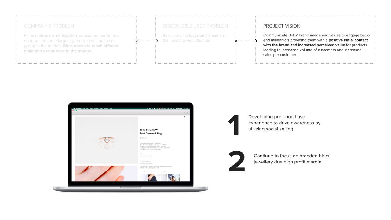 A redesigned web and shopping experience featuring social selling for back-end, affluent millennials in order for them to connect with Birk’s brand and product values. The end goal is to increase perceived value of Birks’ brand/products and establish a more sustainable market for the future, such that Birks is not left behind during the jewelry industry’s massive market shift.