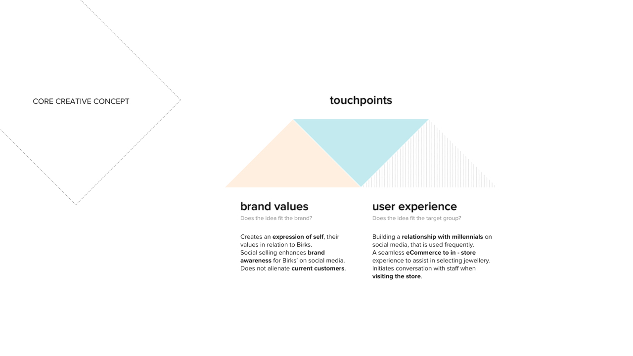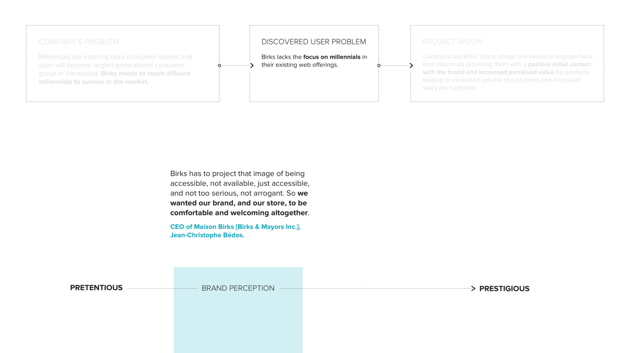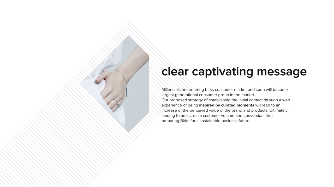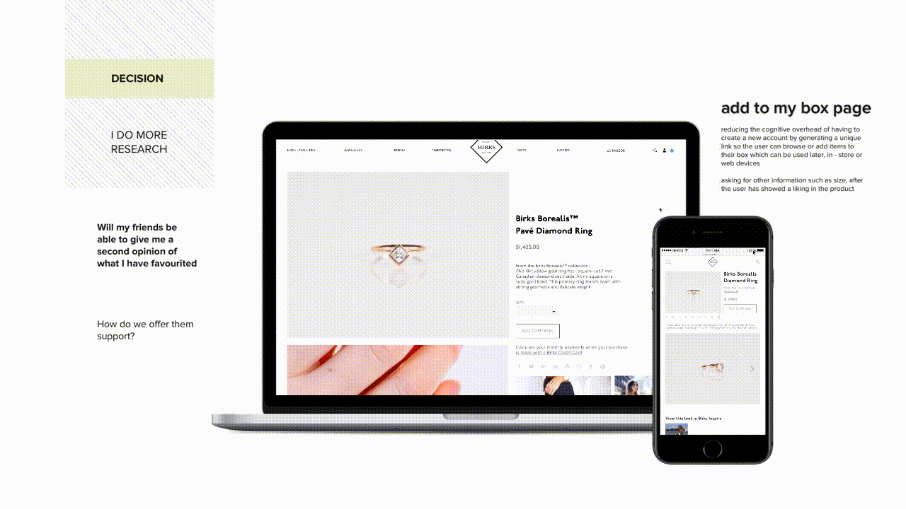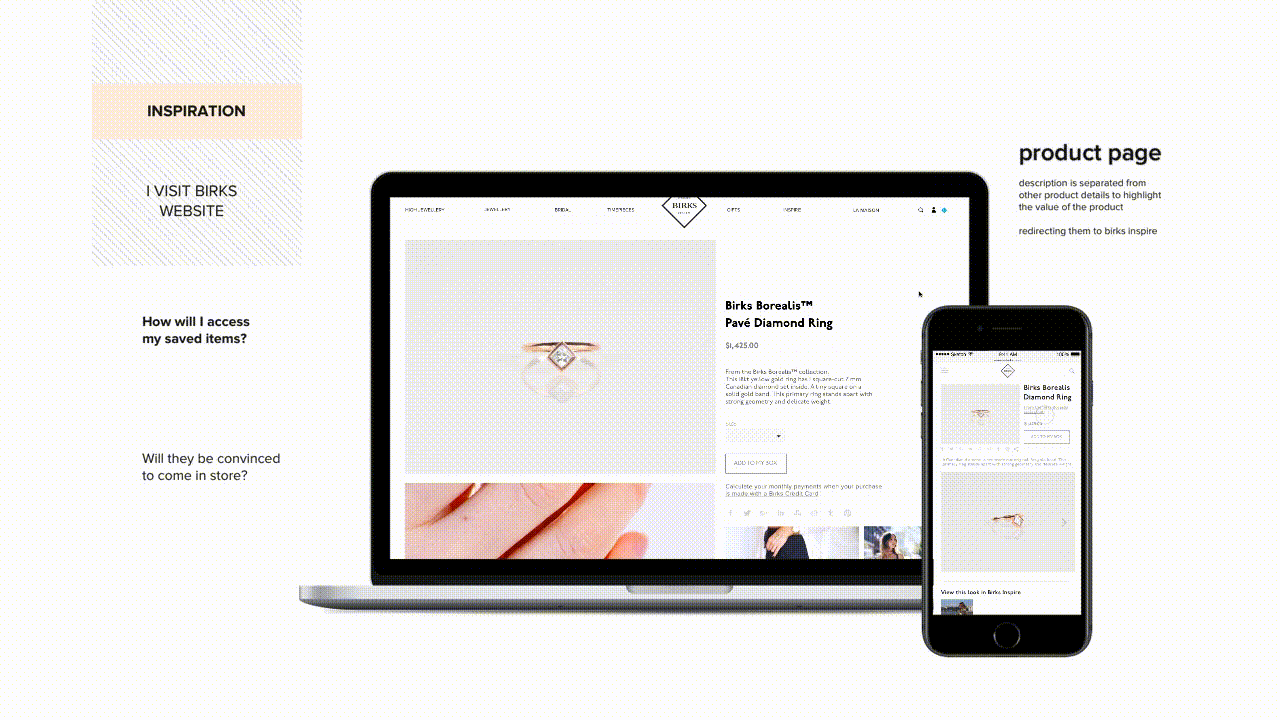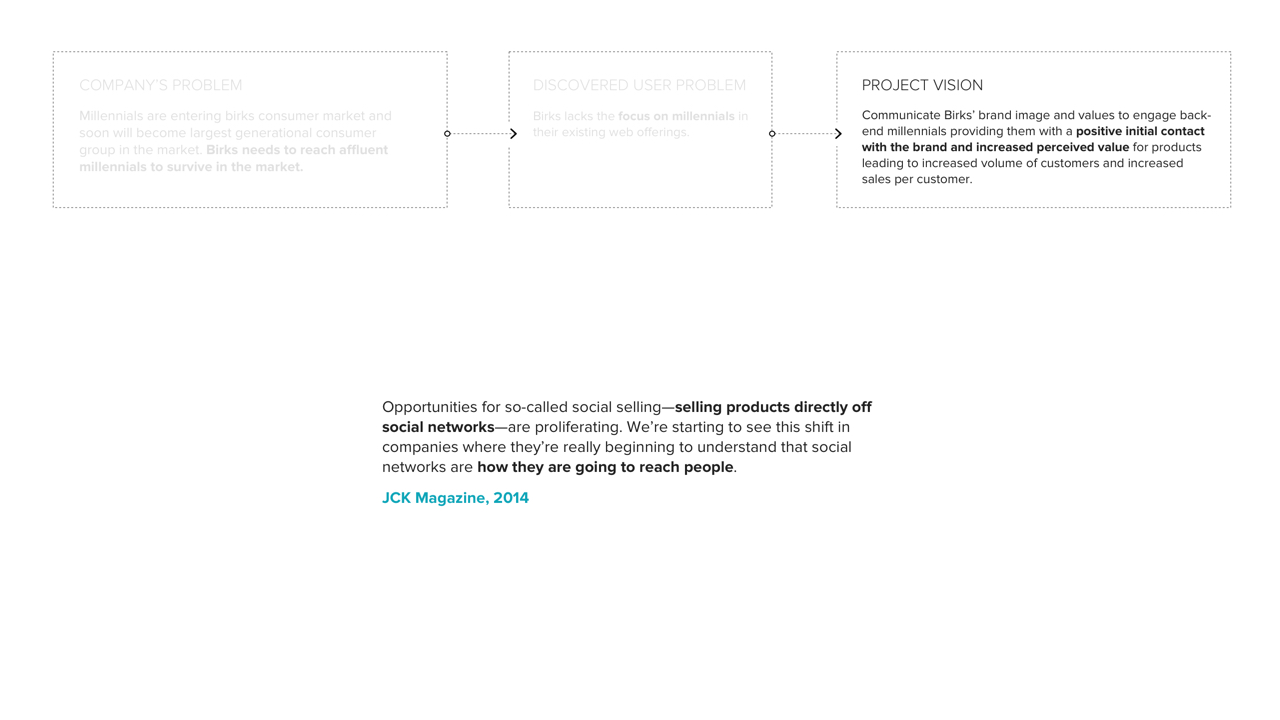 A redesigned web and shopping experience featuring social selling for back-end, affluent millennials in order for them to connect with Birk’s brand and product values. The end goal is to increase perceived value of Birks’ brand/products and establish a more sustainable market for the future, such that Birks is not left behind during the jewelry industry’s massive market shift.